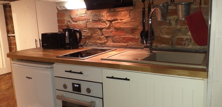 - Keittiössä jääkaappi, liesituuletin, kahvin- ja vedenkeitin, mikro, liesi/uuni ja astiastot.