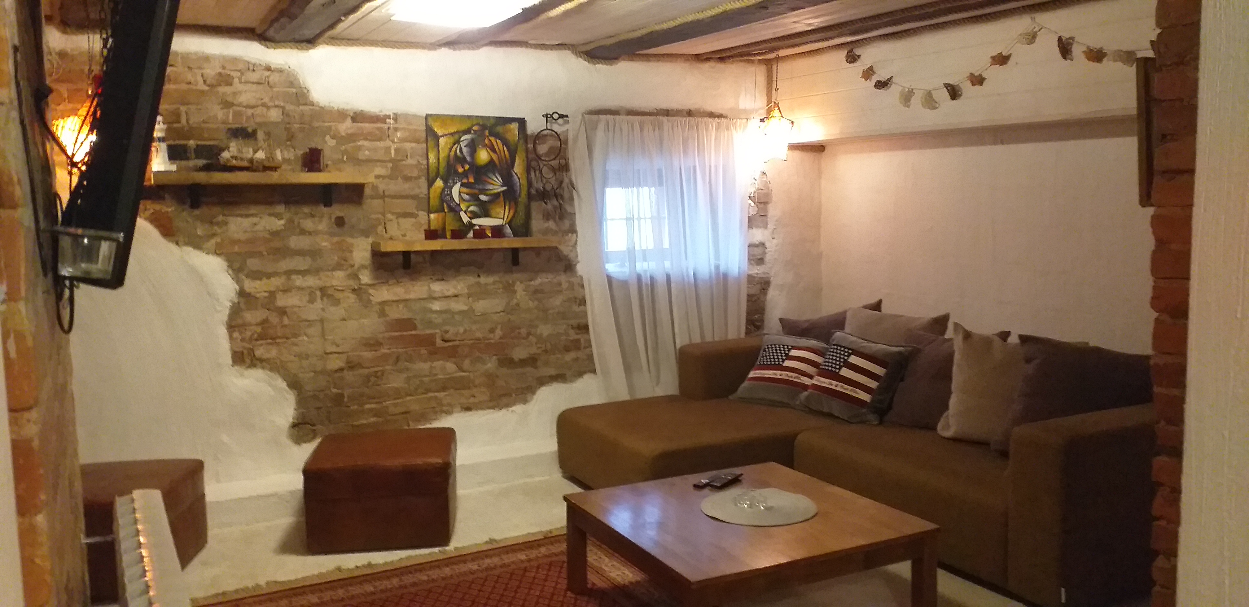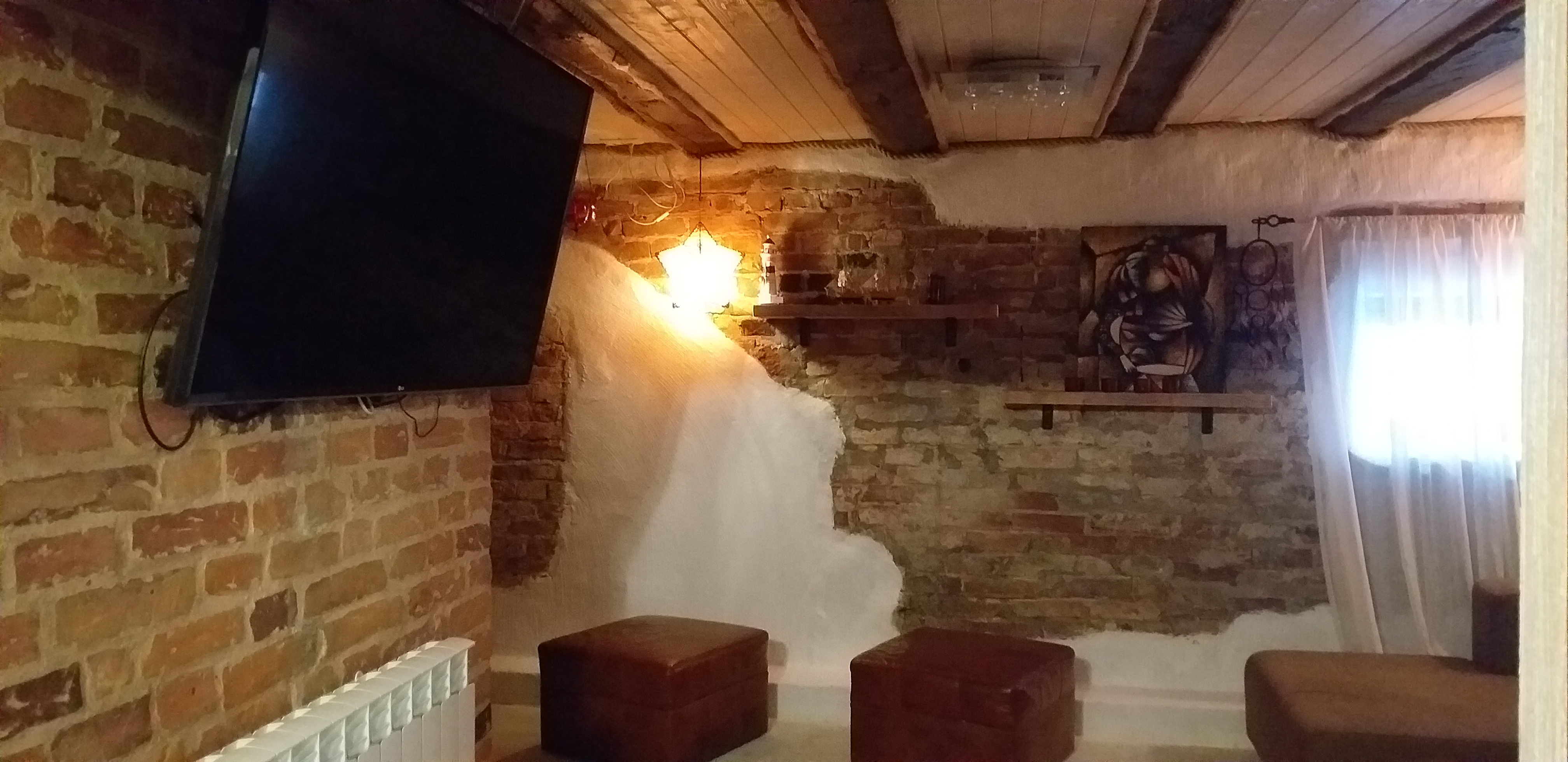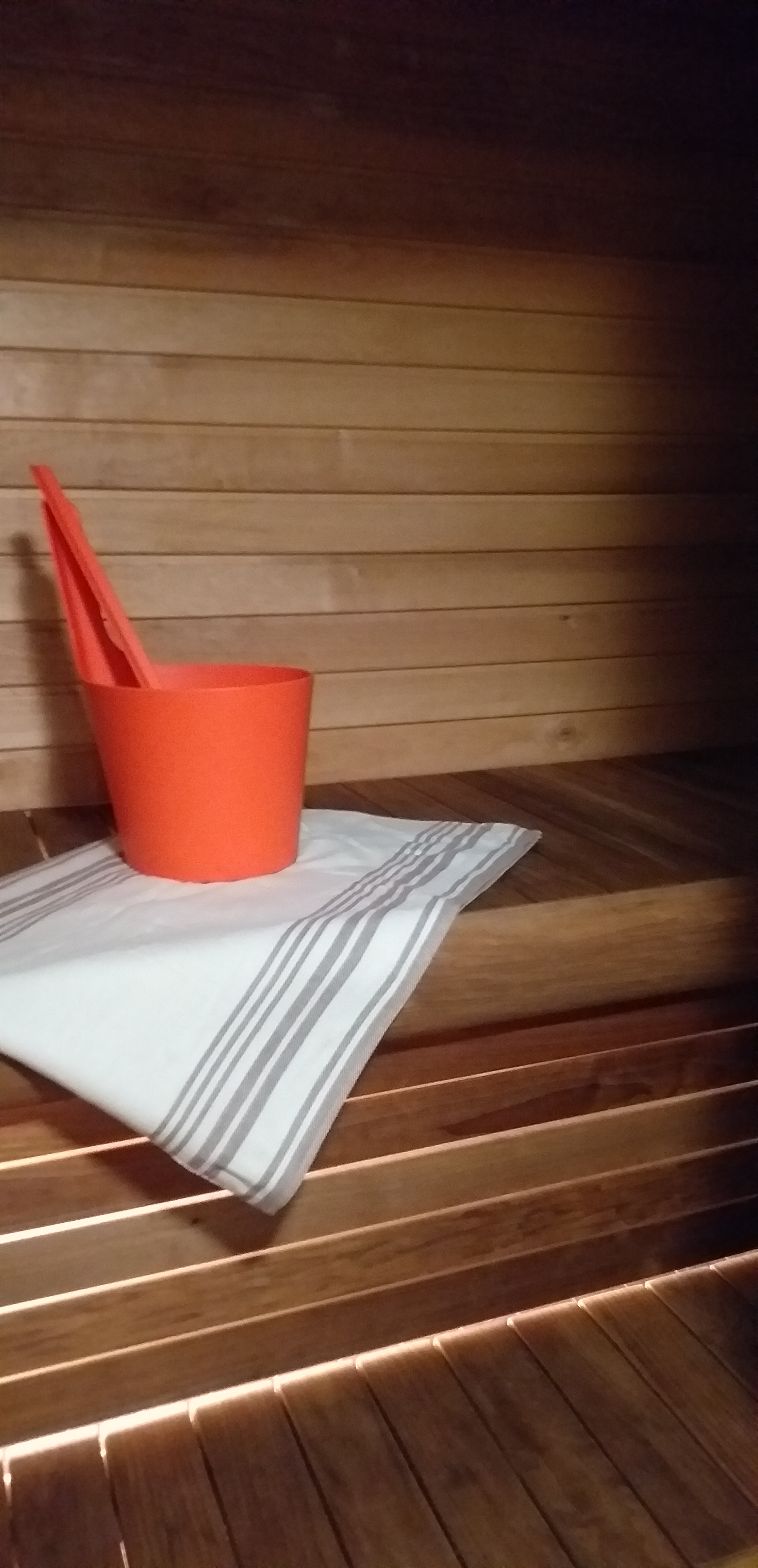 - Kellarikerroksessa sauna, wc/kylpyhuone ja takkahuone, jossa televisio ja takka.
